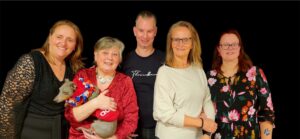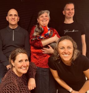 4. Een groepsfoto van HKS werkgroep met de bestuursvoorzitter van links naar rechts: Marjolein, Paula met haar hondje Rex, Japie, Henriëtte en Rachelle.